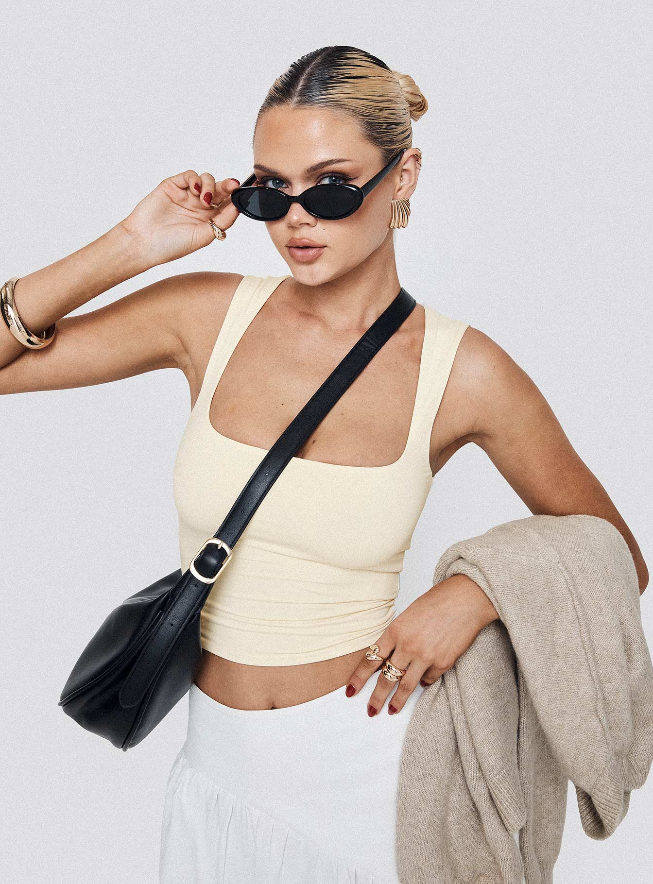 Slim fitting top crafted from 86% reclaimed nylon and 14% elastane, featuring a low square neckline. It offers good stretch and is fully lined, made with a reclaimed nylon blend sourced from recovered manufacturing process fabrics.
