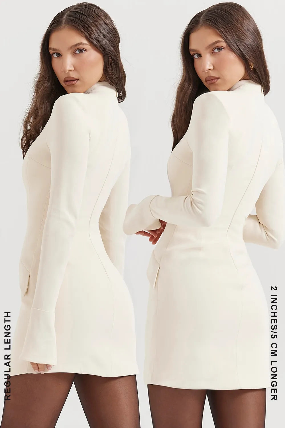 The JADE MINI DRESS is meticulously designed to enhance your figure with its flattering, form-fitting silhouette. The sleek cut is accentuated by chic flap pockets and elegant fluted cuffs, adding a touch of sophistication to your look.