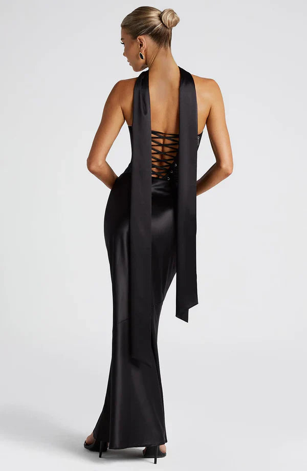 The Samantha Scarf in ivory is the ultimate accessory of the season, adding a refined touch to any outfit. Crafted from luxurious stretch satin, this long, double-layered scarf drapes effortlessly and features angled edges for a sleek finish. Perfect for styling around the neck for an elegant, timeless look.