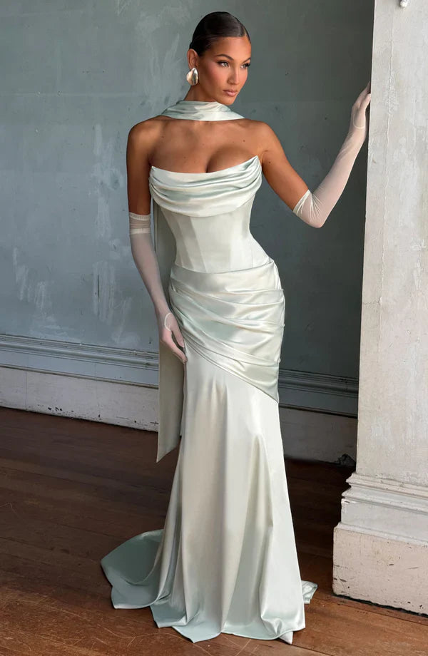 The Samantha Scarf in ivory is the ultimate accessory of the season, adding a refined touch to any outfit. Crafted from luxurious stretch satin, this long, double-layered scarf drapes effortlessly and features angled edges for a sleek finish. Perfect for styling around the neck for an elegant, timeless look.